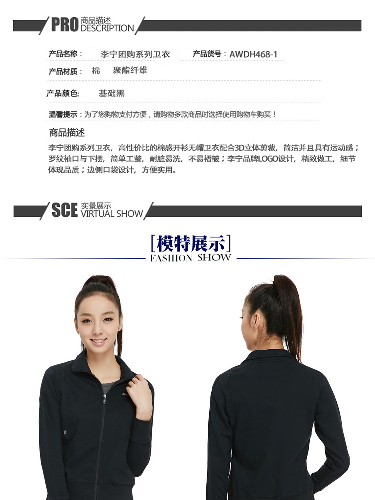 李寧(LI-NING)AWDH486-1 女子團(tuán)購系列無帽開衫衛(wèi)衣基礎(chǔ)黑XL
