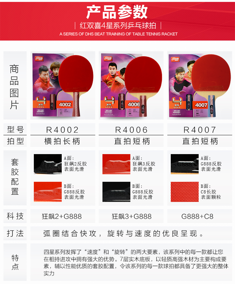 紅雙喜(DHS) R4002-R4003-R4006-R4007四星乒乓球拍