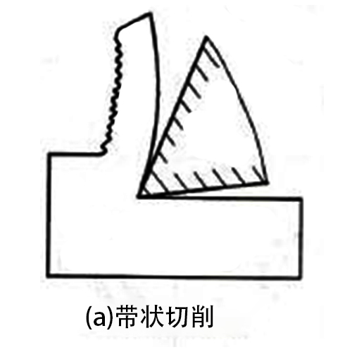 (1)帶狀切削:在切削過程中,如果滑移面上的滑移沒有達(dá)到,破裂強度時(即塑性變形不充分),就會形成連綿不斷的帶狀切削,(見圖 a) 在切削靠近過的一面很光滑,另一面呈毛茸狀。