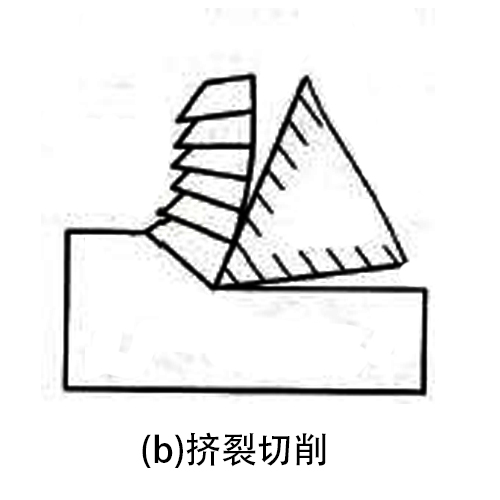(2)擠裂切削(又稱節(jié)狀切削):在切削過程中,如果滑移面上的滑移比較充分,達(dá)到材料的破裂強度時,則滑移面上局部材料就會破裂成節(jié)狀,但與前面接觸的一面還能相互連接未被折斷,稱之為擠裂切削(見圖 b), 較大進(jìn)給切削鋼材時比較容易得到這類切削。