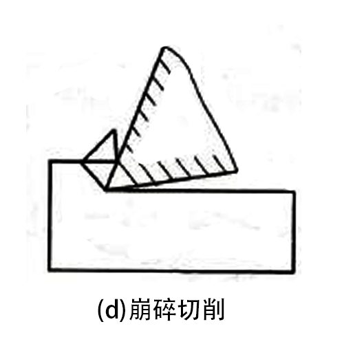 (3)粒狀切削:在切削過程中,如果整個滑移面上均超過材料的破裂強度時、則切削就會成為粒狀切削(見圖 c),用低速大進(jìn)給切削塑性材料時,會出現(xiàn)這類切削。精密零件加工